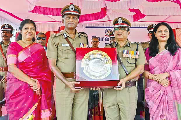 When Rajendran left the office, he took the stairs to reach the portico and got into his car. As a customary gesture he was given a ‘police pulling’ fare well - senior police officers pulled his vehicle using the rope till the gate - and gave him a warm send off.
