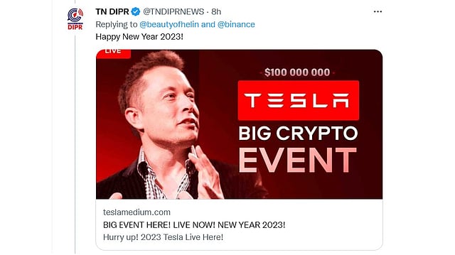 Messages have been posted on the Twitter handle related to cryptocurrencies, one of which stated 'Tesla Big Crypto Event' on the occasion of the New Year.