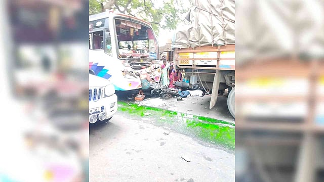 Meanwhile, a goods-laden lorry was heading to a private firm in Namakkal from Harur in Dharmapuri. When nearing Sukkampatti on Tirupattur-Salem road, the lorry slowed down while moving over a speed breaker. The two two-wheelers behind it also slowed down. However, the speeding bus proceeding to Salem hit the two-wheelers, crushing them between it and the lorry.