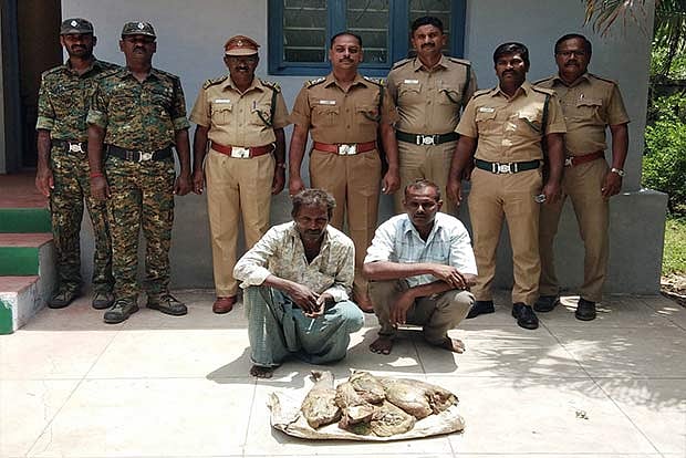 A team of Forest Department staff were on regular patrol in the Perianaickenpalayam forest range on Sunday night, when they came across two persons wandering around with a bag in a suspicious manner on Sunday late night.