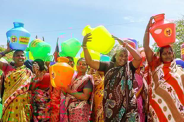 Lok Sabha MP Dayanidhi Maran and DMK senior functionary P K Sekar Babu staged a demonstration with empty pots, demanding that the government ensure drinking water supply to the people.