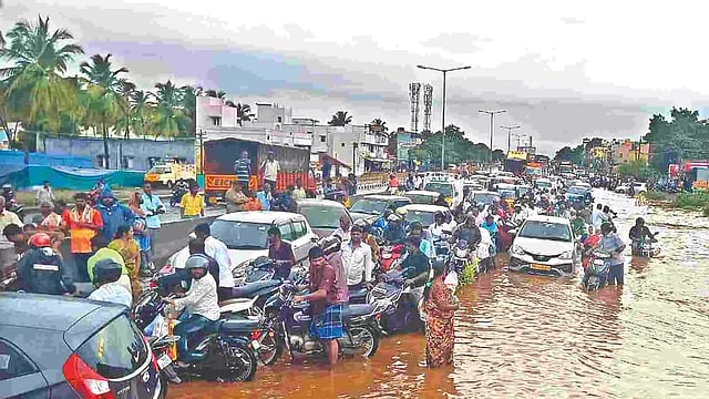 COIMBATORE: Traffic snarls on flooded roads, tree falls, and minor incidents of house collapse were reported in several areas as torrential rains pounded the parts of Western districts on Tuesday.