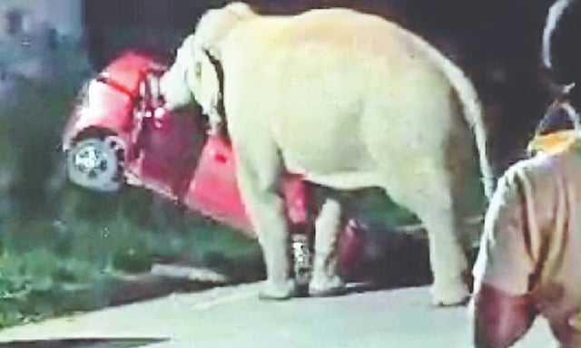 “A wild elephant frequenting the locality unexpectedly attacked the car. It lifted the car with its tusks causing heavy damage to the vehicle before leaving the spot,” according to an official.