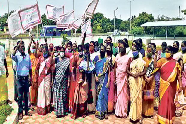 The members of various outfits including the AIDWA, who gathered at Tiruvermbur taluk office and alleged that the employees of micro finance firms threaten the women self-help groups, who secured loans to pay them with interest promptly and reportedly use abusive words against them. Since the lockdown, they demanded relaxation of interest and a moratorium of loans till 2021. Raising slogans, they attempted to besiege the taluk office and Tahsildhar Senthil held talks with the agitating members and assured to speak to the finance firms. Subsequently, they dispersed from the spot.