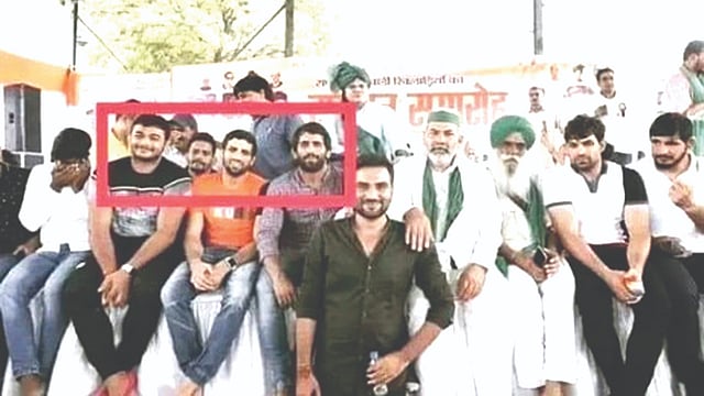 In the photo, wrestlers Bajrang Punia, Deepak Punia and Ravi Kumar Dahiya are seen sitting on a stage along with farmer leader Rakesh Tikait.