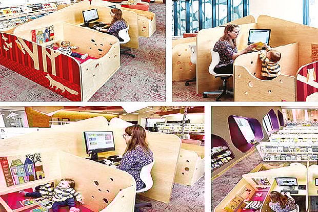 Recently, a tweet about a Virginia library that went out of its way to accommodate parents went viral. The tweet included a photo of a desk or carrel that had a built-in toddler-friendly sidecar, so that parents without child care who need to use the desk’s accompanying computer might have their kids occupied, distracted and comfortably contained for a few minutes, allowing them to focus.
