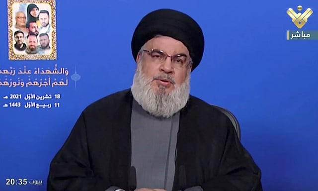 Thousands of supporters gathered to hear the fiery speech at an event in Beirut's southern suburbs, a Hezbollah stronghold, held in memory of the group's fighters killed in Israeli bombardments.