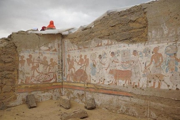 "What has been discovered of the tomb is its entrance built of stone carved with reliefs showing the owner of the tomb. The entrance leads to a hall whose walls have drawings painted and coloured on a layer of plaster," said el-Aguizy, head of the mission.