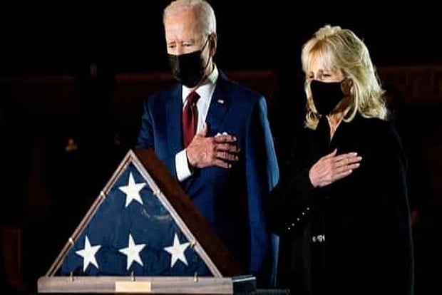 President Joe Biden travelled to the Capitol to pay tribute to Sicknick shortly after the ceremony began Tuesday night, briefly placing his hand on the urn in the center of the Capitol Rotunda, saying a prayer and sadly shaking his head as he observed a memorial wreath nearby. He was accompanied by First lady Jill Biden.