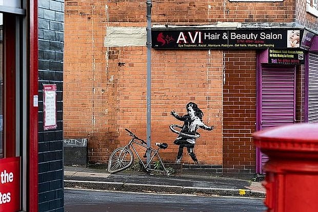 The work, outside a beauty salon, shows a girl hula-hooping with a bicycle tyre. It went up on Tuesday, next to a bicycle that is missing its back wheel, the BBC reported.