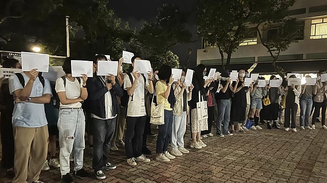 At an event in Central, a business district, about four dozen protesters held up blank sheets of paper and flowers in what they said was mourning for the fire victims in Urumqi and others who have died as a result of "zero COVID" policies.