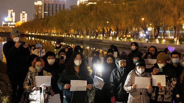 Crowds carrying lighted candles in memory of those killed in the fire at an apartment block reported under COVID-19 lockdown in Urumqi in Xinjiang shouted slogans against the arbitrary lockdowns by the government to curb the spread of the virus and in solidarity with the weekend protests in Shanghai.