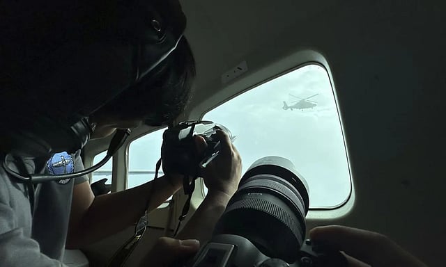 An Associated Press journalist and other invited foreign media on the plane witnessed the tense 30-minute standoff as the Philippine plane pressed on with its low-altitude patrol around Scarborough with the Chinese navy helicopter hovering close above it or flying to its left in cloudy weather.