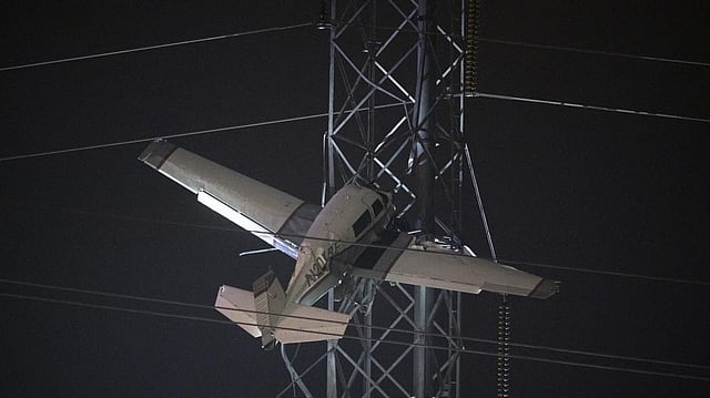 Montgomery County Fire Chief Scott Goldstein said the plane got stuck in the lines about 100 feet (30 meters) above the ground at around 5:40 p.m. Sunday. Responders secured it to the tower at 12:16 a.m. Monday, and the first occupant was removed from the plane at 12:25 a.m. The second occupant was out at 12:36 a.m.