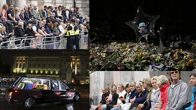 On Tuesday night, thousands braved a typical London drizzle as the state hearse, with interior lights illuminating the sovereign’s flag-draped casket, drove slowly from a military air base into the heart of London.