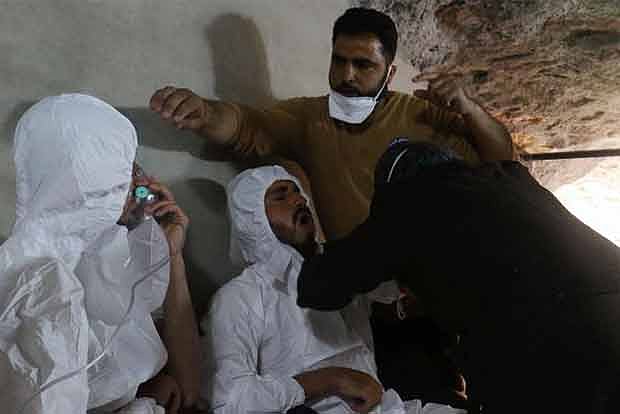 The attack in the town of Khan Sheikhun left dozens suffering respiratory problems and symptoms including vomiting, fainting and foaming at the mouth, the Britain-based Syrian Observatory for Human Rights said. The entrance of the building was hit, bringing down rubble on top of medics who had earlier been seen dousing a steady stream of arrivals to wash away chemical residue.