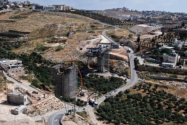The scale of The American Road project, named after a decades-old narrow road that winds through southeast Jerusalem, is evident some four kilometres from the city centre, where a huge bridge is rising in a remote valley. The grey edifice, which can’t be seen from outside the valley, towers over the rural landscape. At the site, cement-mixers rumble through the hill-hugging Palestinian neighbourhoods of Sur Baher and Jabal al-Mukabar toward the 230-metre-long structure.
