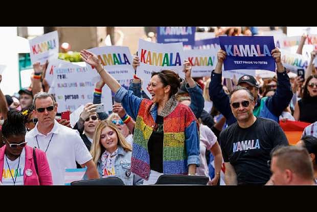 Kris Perry and Sandy Stier, a lesbian couple who were married by Harris when she was Attorney General of California, drove the car that Harris rode in.