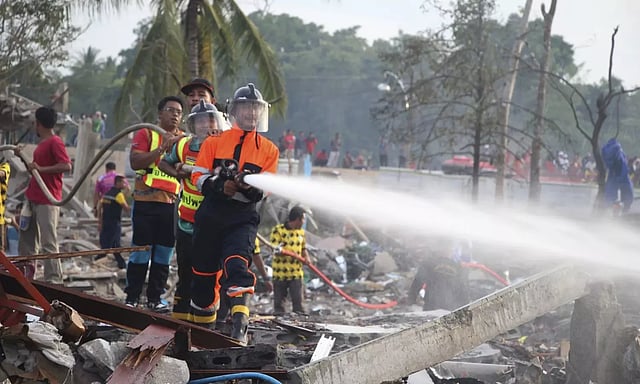 Videos posted on social media from the site show a huge plume of smoke over the area and many damaged structures, cars and motorbikes, as well as streets covered with debris. Many of the houses and other buildings have collapsed roofs and walls.