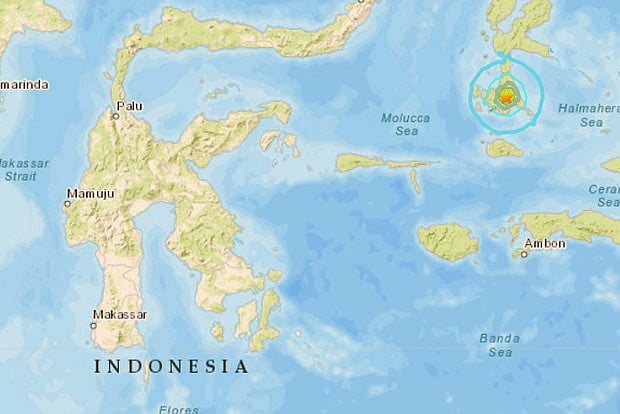 The quake struck about 165 kilometres south-southwest of the town of Ternate in North Maluku province at 6:28 pm local time, at a depth of 10 kilometres, according to the US Geological Survey.