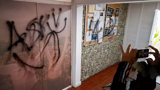 Assailants broke down doors and hauled away valuable documents and equipment in the raid around 3 am, opposition leader Maria Corina Machado's party said. Images published by Machado's party on social media show several walls covered in black spray paint.