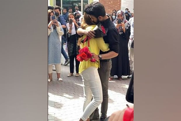 The viral video shows the girl with her right knee bent on the ground, holding a bouquet of roses, proposing to the boy, who then takes the flowers and pulls the girl for a hug. Nearby students are seen cheering them along.