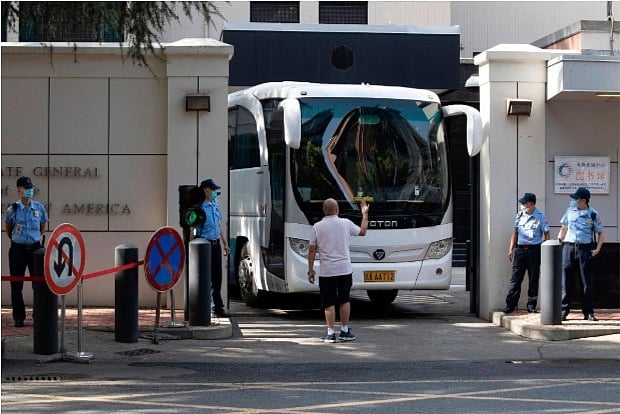 Earlier Sunday, a bus left the consulate grounds and what appeared to be embassy staff spoke with plainclothes police before retreating back behind the property's solid black gates. It wasn't clear who or what was on the bus. China ordered the closing of the Chengdu consulate in retaliation for a U.S. order earlier in the week to close the Chinese Consulate in Houston.
