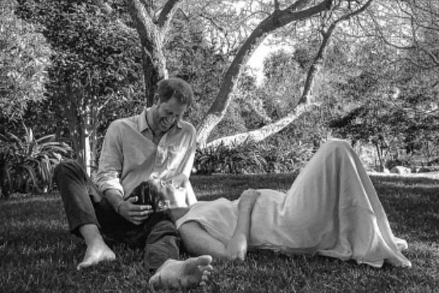 Sharing a black and white picture of themselves under a tree with Harry resting his hand on Meghan's head as she lies cradling her bump, the couple sent social media into a tizzy with the good news.
