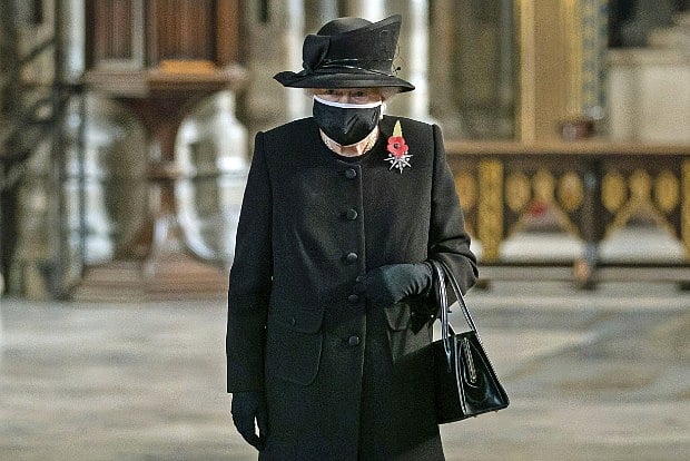 On Wednesday, during her first public engagement in London since March, she wore a black mask that was edged with white. Pictures of the ceremony were officially released late Saturday.