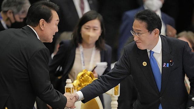 South Korean President Yoon Suk Yeol and Japanese Prime Minister Fumio Kishida met twice on the sidelines of a regional gathering in Cambodia — with U.S. President Joe Biden and then bilaterally.