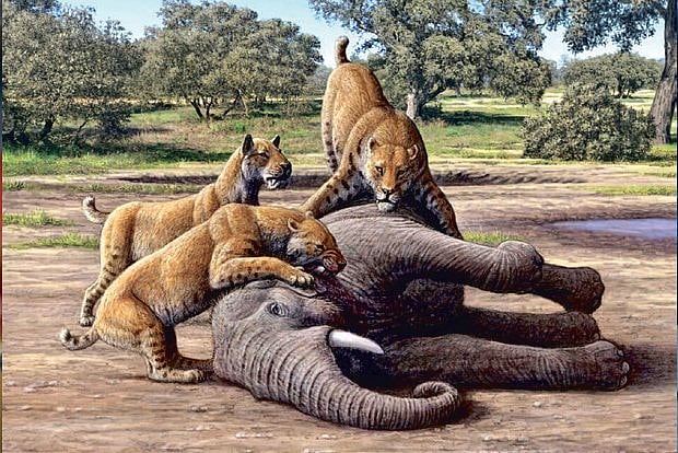 The cats would snatch a juvenile mammoth, blood staining the fur around their mouths and claws as it soaked into the grasses around them. Having eaten their fill, they would take the carcass back to their den. This was a meal that could be shared again later.