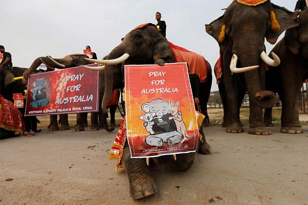 Elephants and their mahouts held up placards saying “Pray for Australia,” with pictures and cartoons of animals at the event organized by the Ayutthaya Elephant Palace & Royal Kraal, a local tourist attraction.