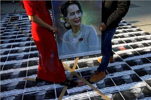 The protesters held placards calling for freedom for Suu Kyi and President Win Myint, who were put under house arrest and charged with minor offenses, seen by many as providing a legal veneer for their detention.