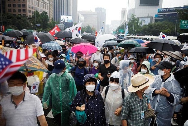 Thousands of anti-government protesters, armed with umbrellas and raincoats, marched through the soggy streets of South Korea's capital on Saturday, ignoring official pleas to stay home amid a surge in coronavirus infections.