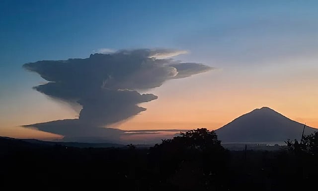 Several eruptions sent ash up to 5,000 metres into the sky Tuesday evening to Wednesday afternoon. An eruption Tuesday afternoon sent thick, gray clouds 10,000 metres into the sky that expanded into a mushroom-shaped ash cloud visible as much as 150 kilometres away.