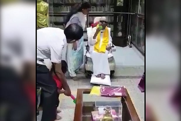 In the two-minute video, the five-time Chief Minister who had largely been confined to his Gopalapuram residence since December 2016 was seen ‘bowling’ a plastic ball to the toddler-batsman assisted by his son Tamilarasu.