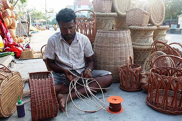 I was born and brought up in Chennai and I started to weave cane baskets to assist my father who was also a weaver. I learnt weaving as I grew up and helped my father after school hours. I studied till Class 12 and wanted to do medicine. But because of financial problems in the family, I could not continue my studies. I tried looking for other jobs but was not able to find a stable income. Even if I was able to find something, the salary would be too low to meet the needs of the family. My wife has completed nursing and she is looking for a government job. We have two children. My children study in a Telugu medium school as we are not even recognised as Scheduled Tribe. The sales are sometimes very good, while other days are bad. I have also started weaving baskets using leather and I wish that these become popular. I am really fond of Chennai as I have seen it change from forests to buildings. I am thankful to the local administration as the police and other authorities have helped us. I want to rise to a stage when people in the whole city should recognise my work and appreciate it. I want my children to study well and get better jobs than what I do for a living.