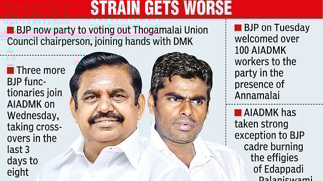CHENNAI/TIRUCHY: At a time when the NDA — led by BJP at the national level and AIADMK in the State — should be strategising for the 2024 Lok Sabha elections, the bickering between the alliance partners is coming to the fore with more crossovers and the saffron party even going along with the DMK to bring down an AIADMK local body chairperson in Karur district.