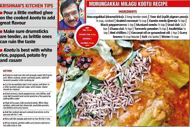 The drumstick tree (Moringa) is one of those rare plant species where nothing goes to waste — be it the leaves, flowers, or stems. Even the ancient kingdoms in the south boasted of popular dishes with drumsticks and leaves. Moringa is not only nutritious but commonly referred to as a ‘super plant’ for its unique, powerful properties that combat different ailments. This nutrient-dense plant has its roots in Ayurveda and was used as a medicine by our ancestors. Different delicacies are prepared with this native plant of India, especially, in south India where it is widely consumed. Today, we share the recipe of Krishnan’s favourite dish murungakkai milagu kootu.