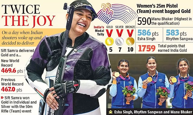 Indian shooters dominated proceedings at the #AsianGames as #SiftSamra bags two medals in 50m Rifle on Sept 28, 2023. India's medal tally now stands at 5 Gold, 7 Silver and 10 Bronze.t