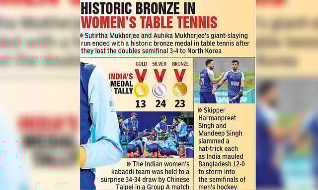 Sutirtha Mukherjee and Auhika Mukherjee's giant-slaying run ended with a historic bronze medal in table tennis after they lost the doubles semifinal 3-4 to North Korea. India's medal tally as of now stands at 13 gold, 24 silver & 23 bronze.