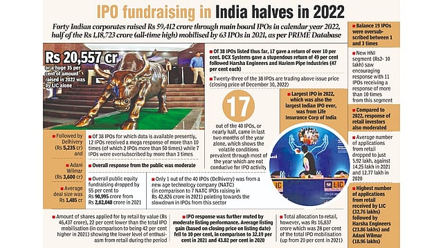 Forty Indian corporates raised Rs 59,412 crore through main board IPOs in calendar year 2022,