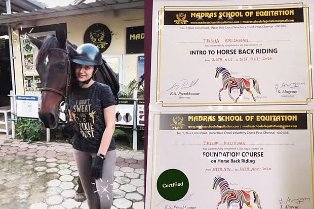 Trisha posted the photo of her horse riding course certificate on her Instagram story. In the certificate issued by Madras School of Equitation, it is mentioned that she had joined the course on November 9. The six days course ended on November 14.