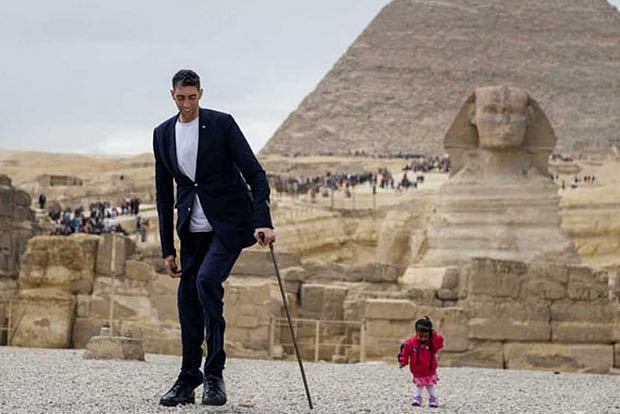 Kosen is from Ankara, Turkey and his height is caused by a condition known as pituitary gigantism, where the brain produces abnormally large amounts of growth hormone from the pituitary gland. Kosen was the first man over eight feet to be measured by Guinness World Records in more than 20 years. He first became the world’s tallest living man in 2009, when he was 2.47m tall. He has since grown taller. Sultan has four siblings and the rest of his family are of average heights. He was married in 2013. Kosen met Jyoti for a photo shoot in front of the Giza pyramids on Friday. They were visiting the country to promote tourism in Egypt.