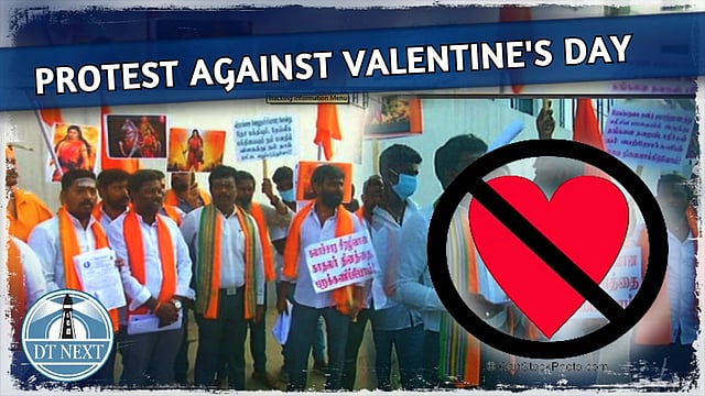 In a protest against Valentine's Day, Bharat Hindu Front in Tamil Nadu organized a protest near a private college in Chennai on Feb. 14. They carried photos of freedom fighters and raised slogans against Valentine's day. They also distributed pamphlets to the students who had come to the college. After the protest was over, the Hindu outfits were removed by the police.