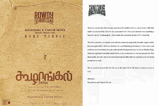 Vignesh Shivan took to twitter to announce his production venture. His tweet read " Happy to have Produced this Gem of a movie made by @PsVinothraj. #Nayanthara your selection of unique stories to produce & present makes me feel happy & excited. Good luck to us on the festival circuit. Thank you @thisisysr sir #koozhangal #pebbles".