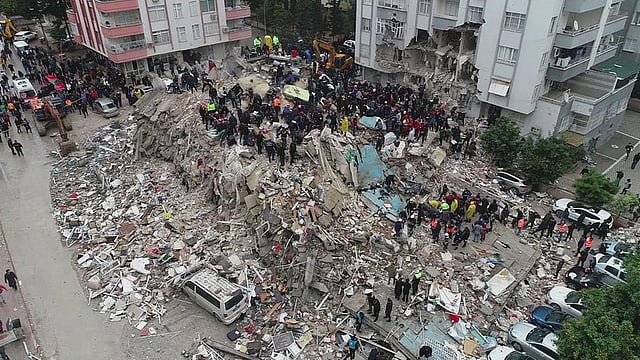 In the Turkish city of Diyarbakir, Reuters journalists saw dozens of rescue workers searching through a mound of debris, all that was left of a big building, and hauling off bits of wreckage as they looked for survivors. Occasionally they raised their hands and called for quiet, listening for sounds of life. Men carried a girl wrapped in blankets from a collapsed building in the city. In Izmir, drone footage showed rescue workers stood atop a hill of rubble where a building once stood, working to lift slabs of masonry.