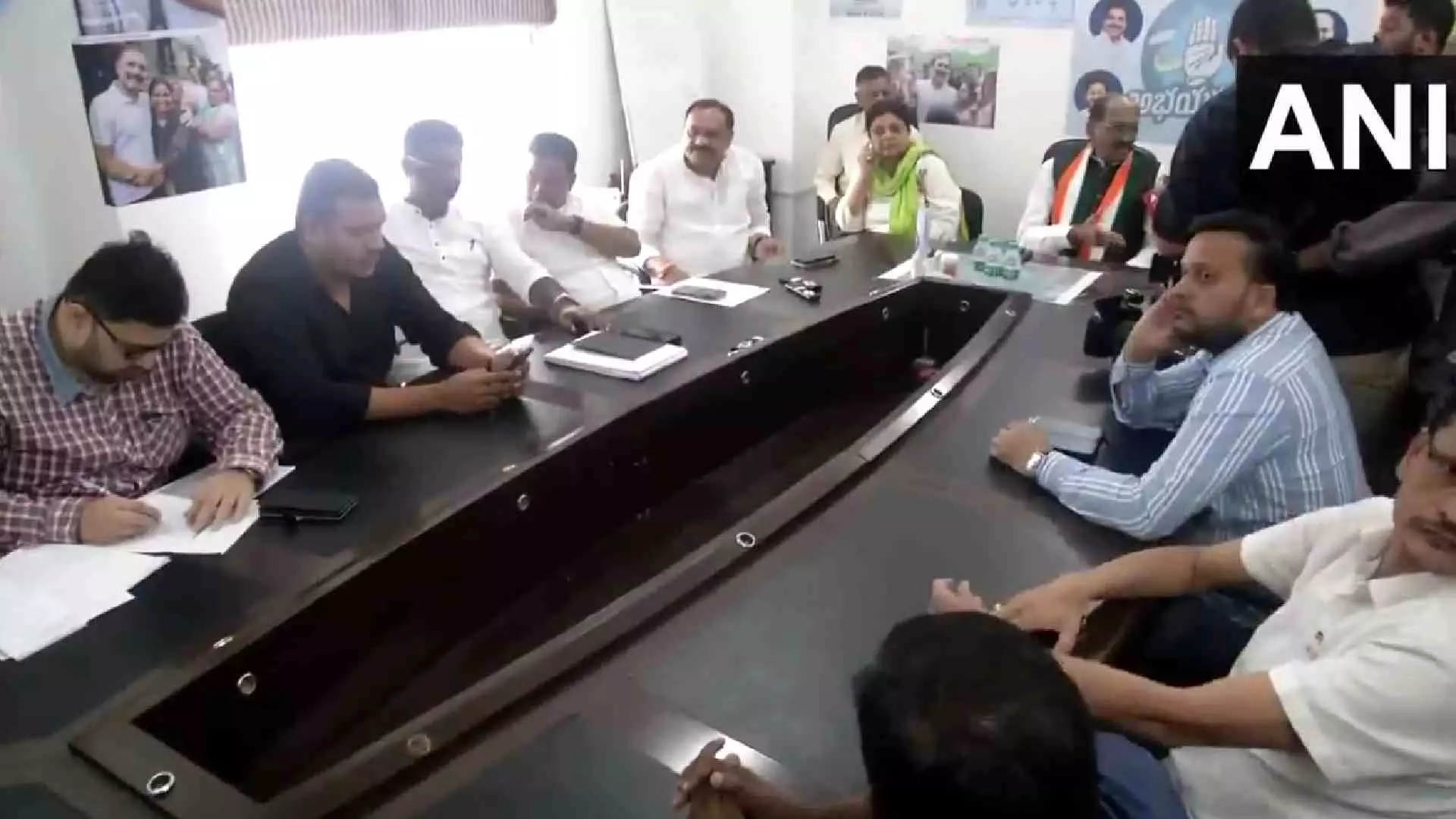 Congress Telangana in-charge Manikrao Thakare along with party leaders observes early trends in election results, in Hyderabad