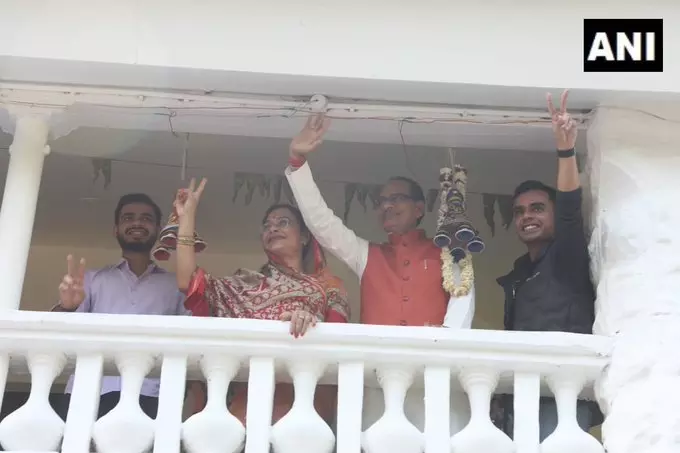 Madhya Pradesh CM Shivraj Singh Chouhan along with his family greets party workers and supporters in Bhopal