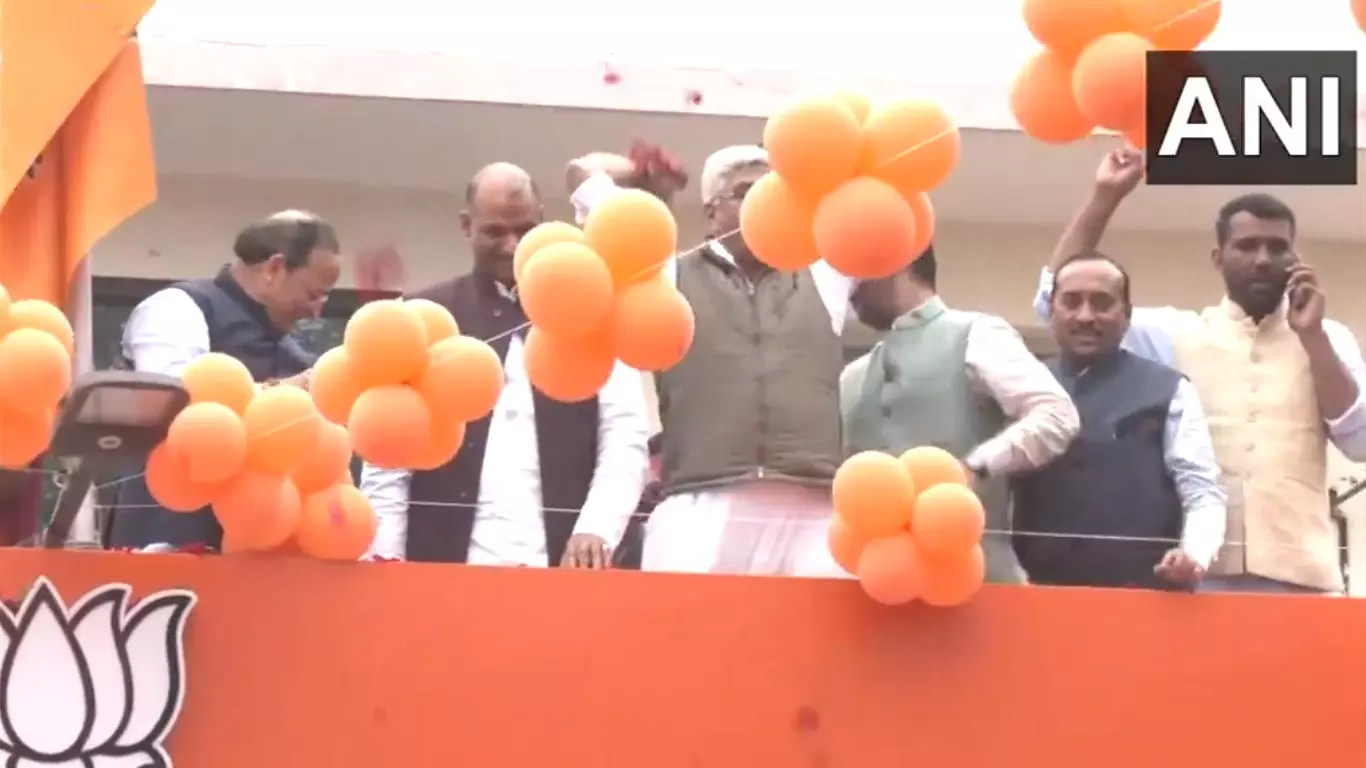 Rajasthan BJP president CP Joshi, Union minister and BJP leader Gajendra Singh Shekhawat and other party leaders celebrate at the party office in Jaipur as the party heads towards a landslide victory in the state.